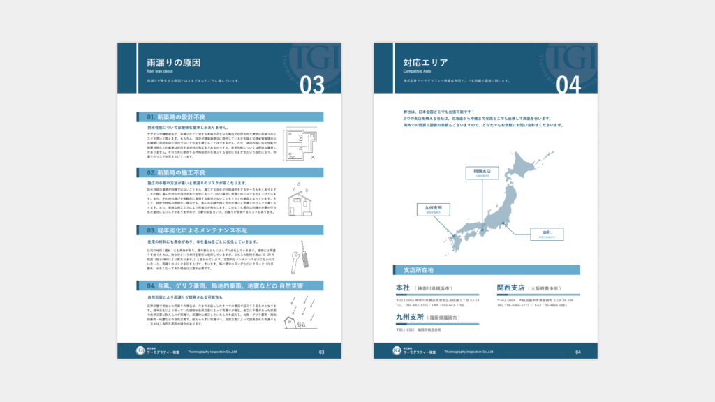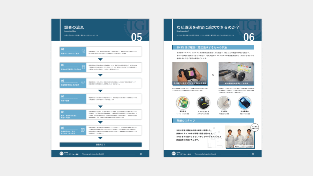 “雨漏り調査”というものが、かなりニッチな専門業種であることと、わかりにくさもあるので、A4サイズの表面に訴求をわかりやすく記載して、裏面に概要を細かく記載することになりました。