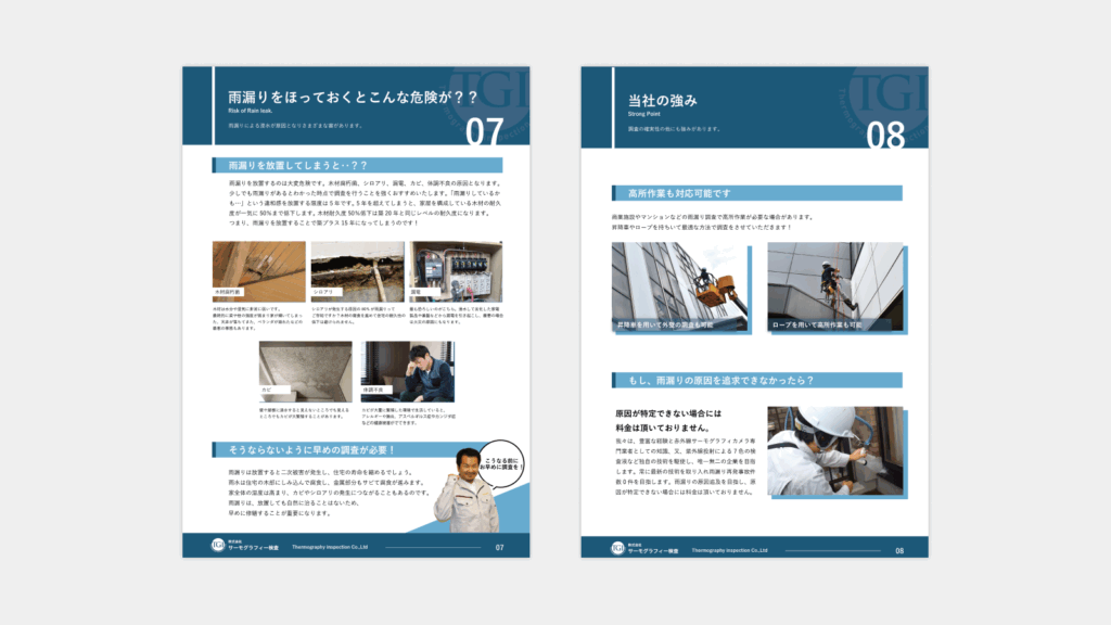 ホームセンターなどに設置された際に、すぐに手に取りやすいようにわかりやすくキャッチーに制作してほしいです。雨漏り調査の専門会社なので、わかりにくさもあると思うし、情報量も多いのでうまくまとめてほしい。